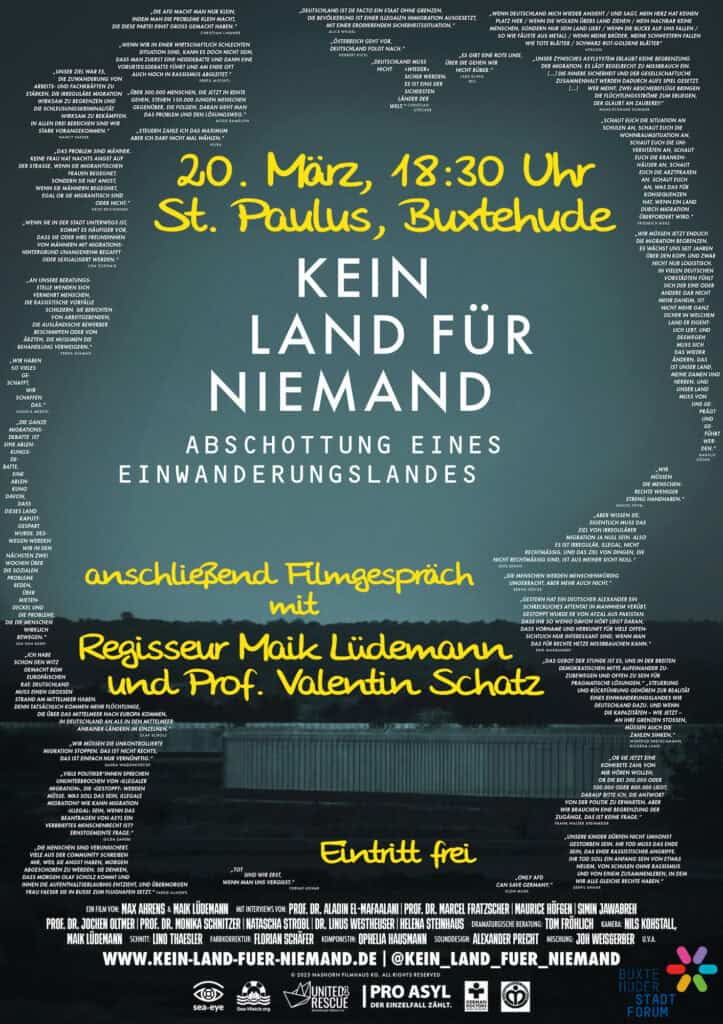 Bundesweit haben inzwischen mehr als 30.000 Menschen „Kein Land für Niemand - Abschottung eines Einwanderungslandes" gesehen. Auch die Buxtehuder Erstaufführung des preisgekrönten Dokumentarfilms war mit über 160 Zuschauerinnen und Zuschauern ein großer Erfolg!